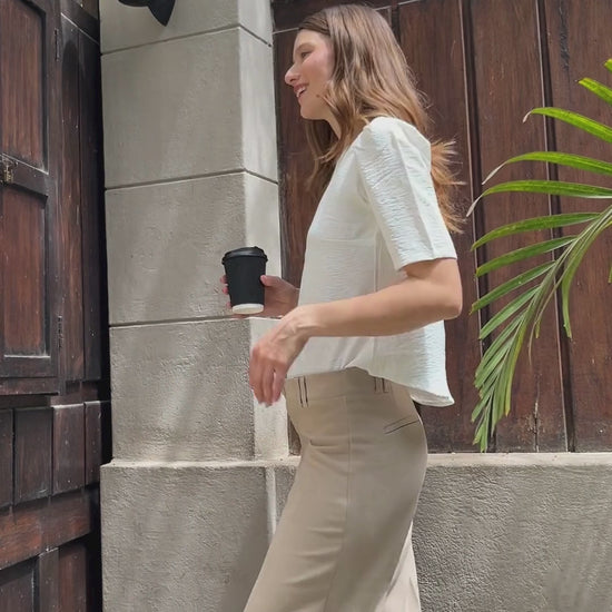Blusa Irina texturizada en tono perla, confeccionada en un tejido con relieve sutil que aporta elegancia y movimiento. Su diseño de mangas amplias con pinzas crea una silueta delicada y femenina, ideal para elevar looks cotidianos con un toque sofisticado. Perfecta para combinar con piezas neutras o de color, aportando luz y textura a cualquier outfit.