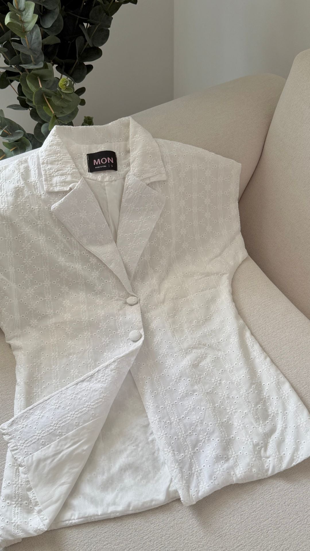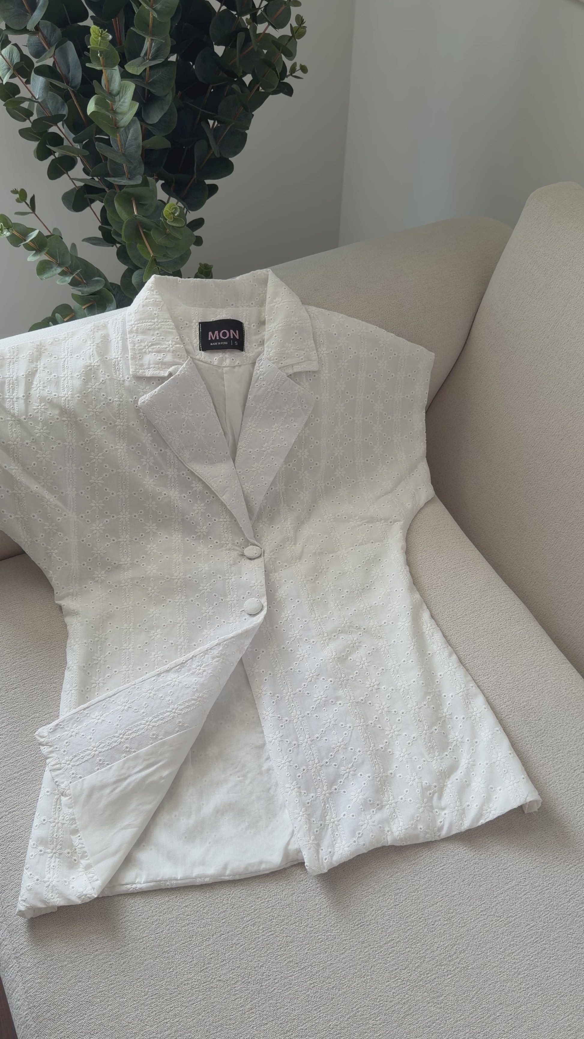Chaleco broderi tejido en color perla, manga corta, con pinzas para un fit femenino, botones delicadamente forrados en su misma tela, forrado en un lino 100 % algodón para aportar frescura en dias soleados.